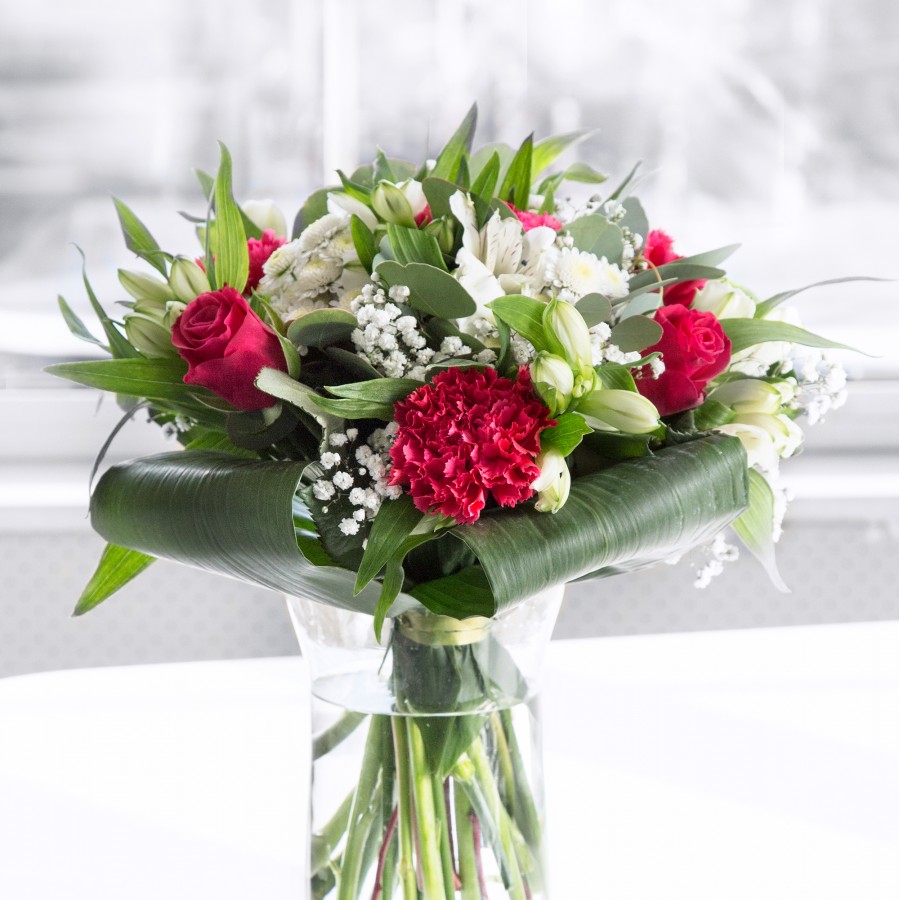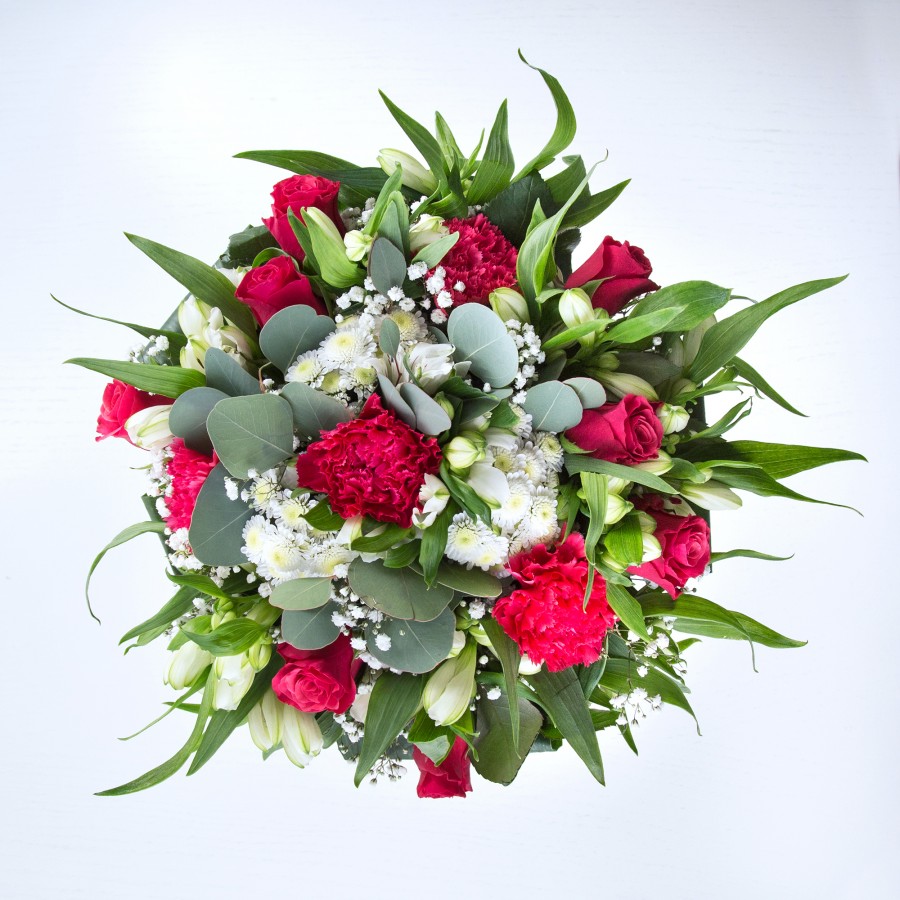 Brighten any occasion with our Luminous Bouquet of Joy. This enchanting arrangement fuses sweet white chrysanthemums and delicate gypsophila with the bold presence of red roses and graceful carnations. The blend is artfully finished with pristine white alstroemeria and textured aspidistra leaves. Each flower is carefully hand-selected to ensure unmatched freshness and aesthetic elegance.
